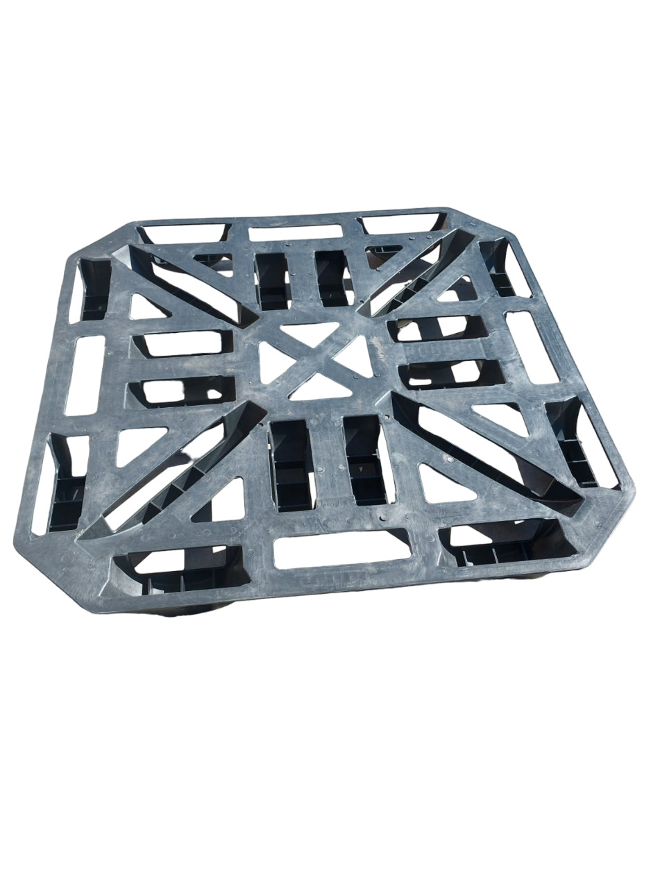 Pallet Plástico 109×109×14 EkoBag – Pallet Encaixável para Big Bags de 1 t. Suporta 2 000 kg estático/1 000 kg dinâmico. Leve (8 kg), encaixável, reutilizável e reciclável.