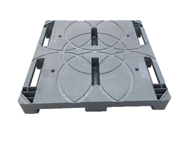 Pallet Plástico 110×110×14 cm para Tambor, suporta 2,5 t estática, 1,5 t dinâmica e 1 t em estantes. Acomoda 4 tambores e possui compartimento para conter vazamentos.