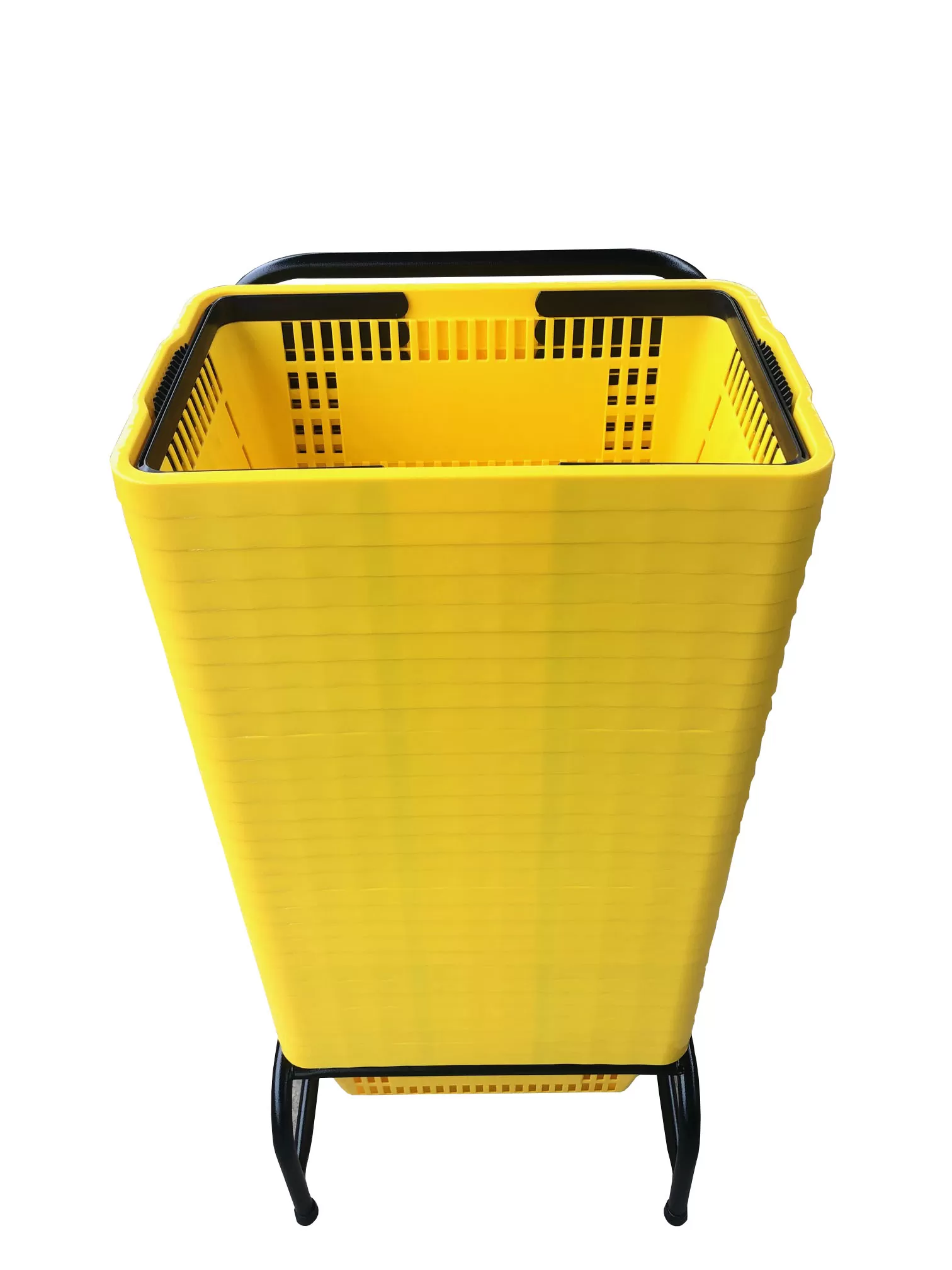 O suporte organiza o fluxo de cestas, melhora a percepção de limpeza e evita que clientes e equipe tropecem em pilhas improvisadas.